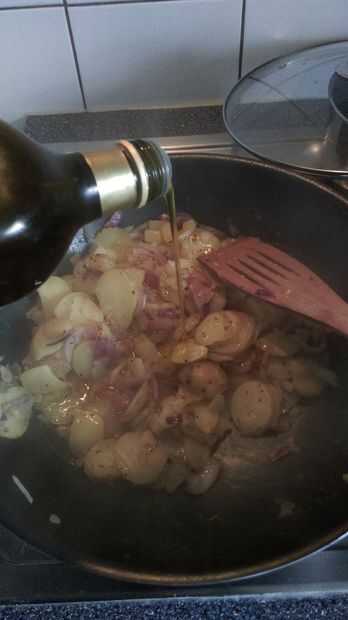 Cuando el agua se haya evaporado completamente (pero las verduras todavía húmedas), añada aceite de oliva a la parrilla las papas y cebollas.