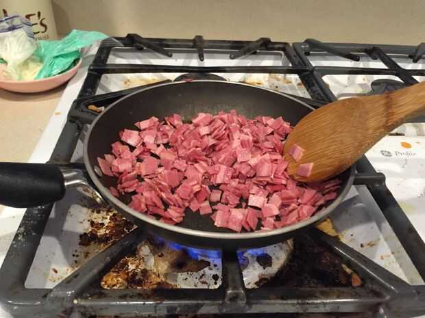 Cortar 6 rebanadas de tocino en cuadritos pequeños y cocer en una sartén a fuego medio hasta que esté listo. Al finalizar, traslado a una sartén grande y empezar a derretir la mitad un palo de mantequilla en la sartén. (vamos a utilizar la otra mitad más tarde).