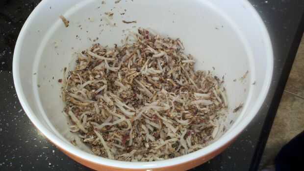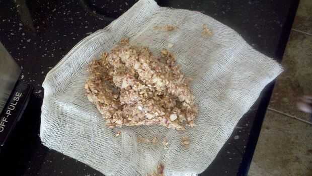 Con el paño de queso, exprimir tanto líquido como sea posible. Patatas y setas tienen un montón de humedad natural, y esto puede hacer las hamburguesas a desmoronarse.