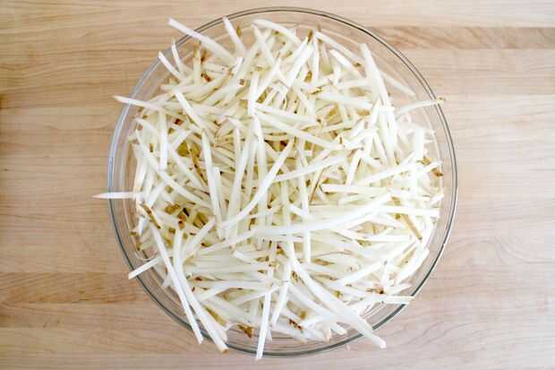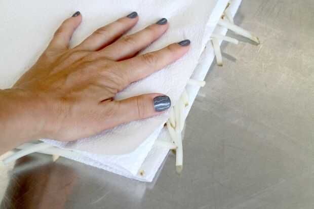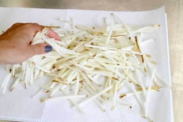 Luego colocar los pedacitos de tater hilar sobre toalla de papel o toallas limpias y pat con otra toalla para hacer las rebanadas como hueso seco como sea posible. Cuanta más agua se que puede quitar, al menos salpicaduras al poner en el aceite.