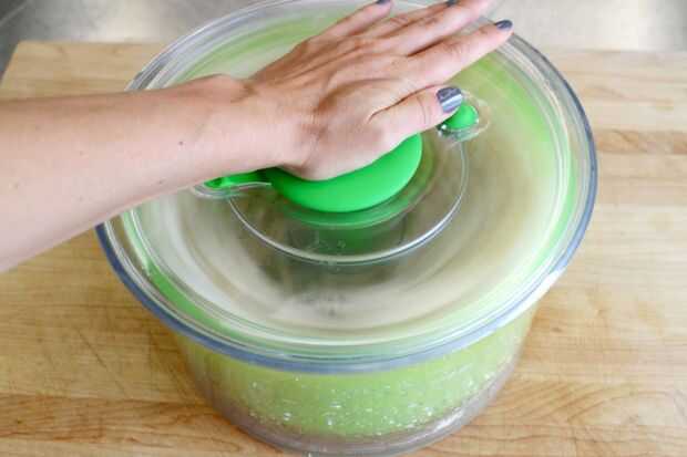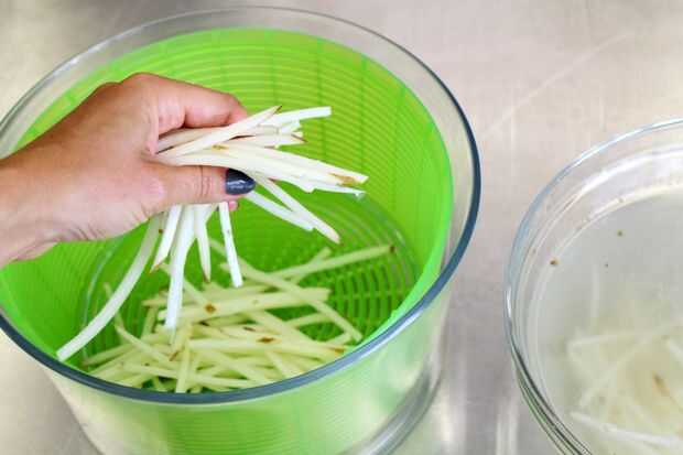 Poner las rebanadas swished en un centrifugador de ensalada e ir a la ciudad eliminar tanta agua como sea posible.