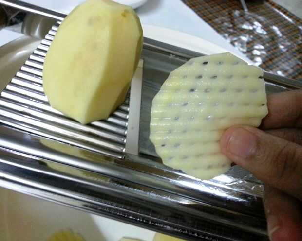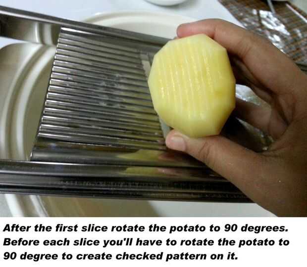 Antes de cada rebanada tendrás que girar la papa a 90 grados para crear el patrón comprobado,