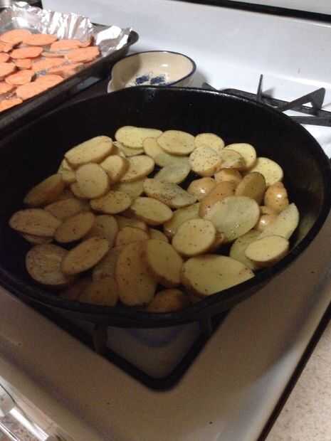 Finalmente pones las patatas en la sartén caliente. (Tenga cuidado de aceite salpicar en usted) luego cubra con una tapa y deje que se sientan sobre 8 o más minutos luego dé vuelta y hacen lo mismo, o hasta un color marrón.