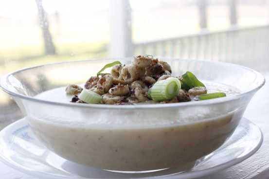 Escoja sus hojas de laurel y descartar. Puré la sopa con una licuadora hasta que se ve brillante y lisa (o un poco a la vez en una licuadora, pero tiende a ser un lío caliente húmedo).