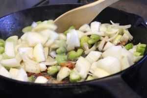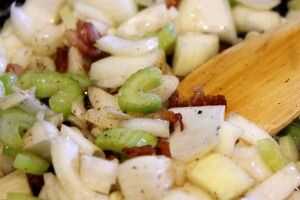 Cuando la mantequilla se haya derretido, añadir ajo, revolver y echar el picado cebolla y apio.