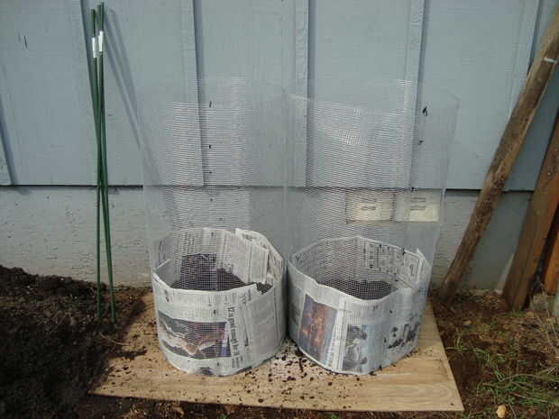 Si desea utilizar uno (o ambos), como un compostador, yo sugeriría conseguir algunas estacas jardín alto con dos por el cilindro (por el suelo en el interior) para mantener los cilindros en su lugar. Estacas pueden verse a la izquierda en la primera foto de abajo. Esto hará que el compostaje fácil moverse y acceder a la composta.
