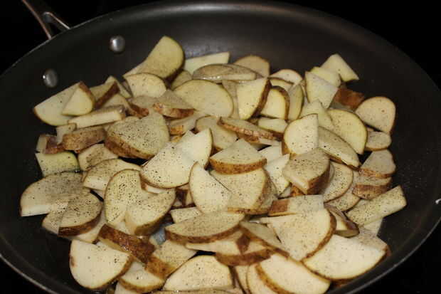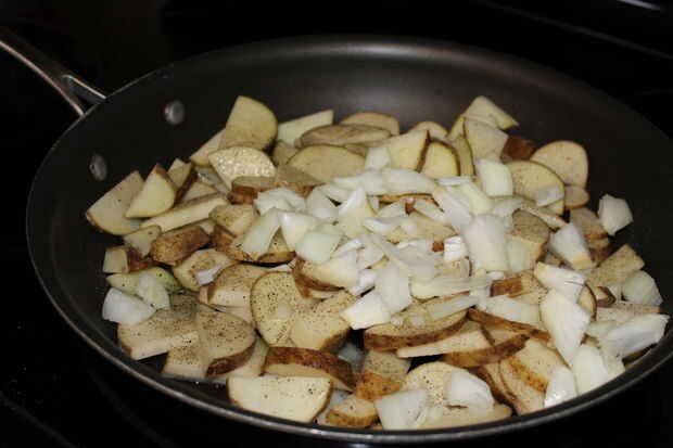 Coloque las papas y cebollas en la cacerola. * Añadir sal y pimienta al gusto.