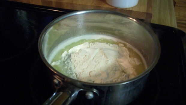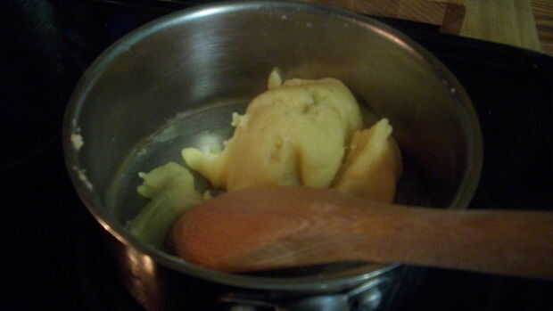 Intenta alcanzar una masa dry-ish aquí, mientras también cocine la harina. La Pasta choux es un animal extraño y puede ser un poco exigentes para trabajar con que dar tiempo al tiempo, unos 5 minutos. Quieres una fina capa de masa cocida a la forma en la parte inferior de la cacerola y para la mayoría de la masa están revolviendo para venir juntos en una bola. Tendrá vapor que de él, así que tenga cuidado de no quemarle las manos.