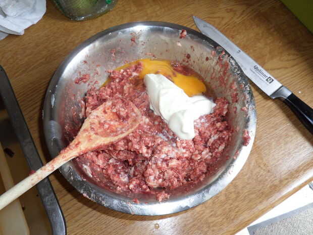 Añadir el huevo y la crema y revuelva bien. Guardarla en el frigorífico mientras prepara los otros ingredientes.