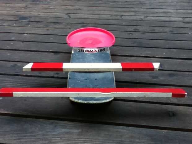 En este paso usted necesita obtener una tabla de Skate. Asegúrese de que usted puede sentarse en él y montarlo sentados. Entonces encontrar un pedazo de madera y tornillo en la parte delantera como se muestra.