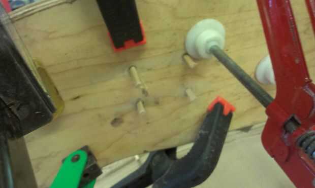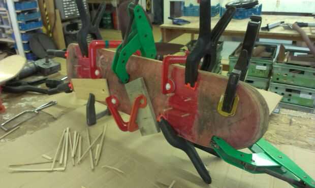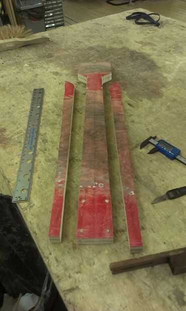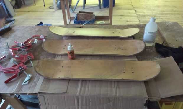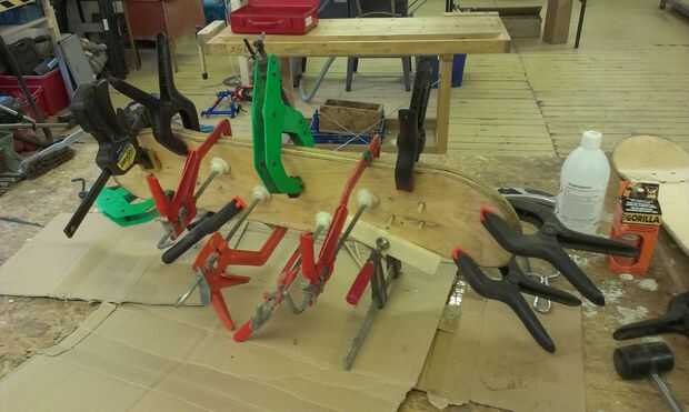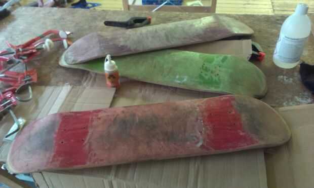 Yo se que lamina dos cubiertas para profundidad extra y rigidez. En el talón, voy a usar tantas capas que sea necesario. Quiero conservar el auténtico skate usado deck daño (dentro de razón) sobre el diapasón. De mi colección de cubiertas pero he elegido dos cubiertas en blanco Unión idénticos (presionar mismo, cóncavo mismo) sin demasiado daño. Con el griptape quitado y una rápida limpieza con alcohol isopropol hago pegamento laminación-hasta con pegamento del gorila y saltaron en algunos tramos de los palillos de bambú como tacos para alinear los agujeros de perno, llenarlos en y tal vez añadir una pequeña fuerza. Como norma Abram dice, "nunca tendrás demasiadas pinzas". Después de 24 horas de curado se hacen los primeros cortes ásperos en la Sierra de cinta.