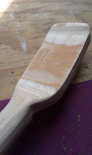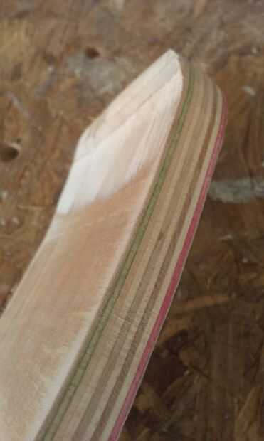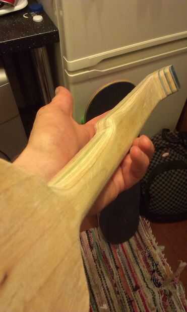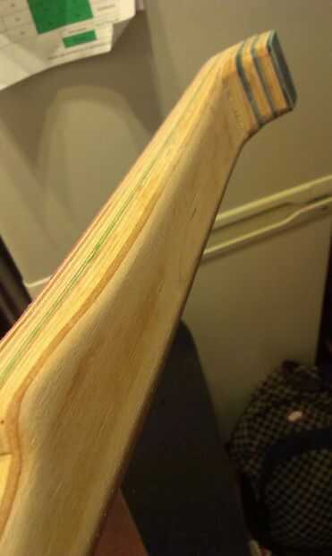 Con el fin de aligerar el cabezal y para dar cabida a la norma (barata y repugnante) tamaño clavijas de afinación que corte una bola fuera de la parte posterior a unos 13 capas gruesas (griptape laterales de las bandejas!). Esto trajo cierta elegancia necesaria a la forma y había expuesto la belleza natural de la ply(!) de skate y la veta de la madera después de alguna meditación-lijado a mano.