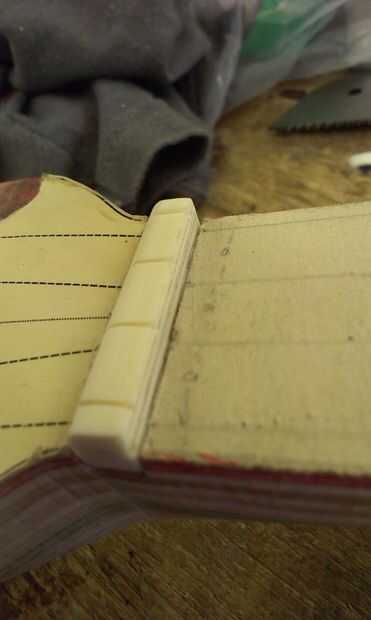 Mi diseño tiene 9mm entre los centros de la cadena dando un lapso de 36mm entre secuencias 1-4. Había ya "instalado" la anchura de la tuerca y la longitud (a lo largo de la neck-wise) pero no establece la profundidad--poco sentido hasta que se estableció la altura de los trastes. Marqué la altura del traste básico con un "medio lápiz" que había hecho para sólo este trabajo. A continuación, configurar el galgas a una profundidad de 2,5 mm para marcar la profundidad inicial de las cuerdas (para ser refinado más adelante) y guías para cada cuerda hasta este nivel usando un pullsaw de "cero-corte". Después quitar la tuerca y tierra abajo de la altura básica y vuelco en la lijadora de banco. Cuando reinstalado la tuerca utilicé unas gotas de pegamento. No tienen y estoy poco probable obtener un conjunto de archivos de la tuerca y por lo que voy a hackear algunos abrasivos pequeñas tiras con tolerancias exactas. La tuerca permanecerá áspera hasta que tenga las cuerdas en su lugar.