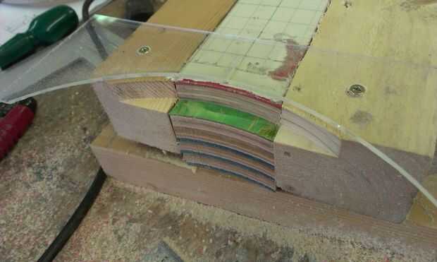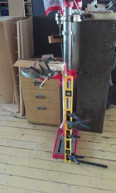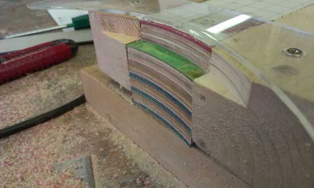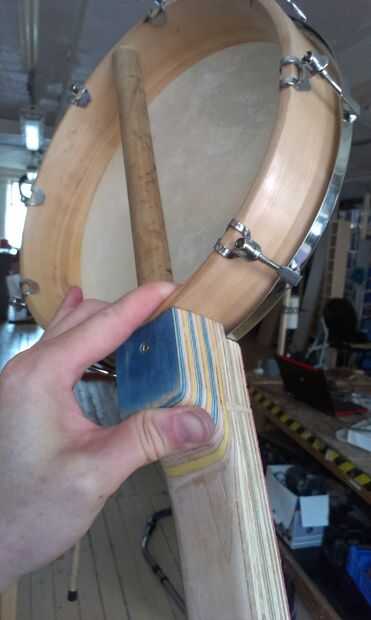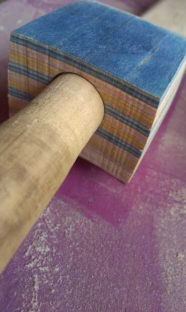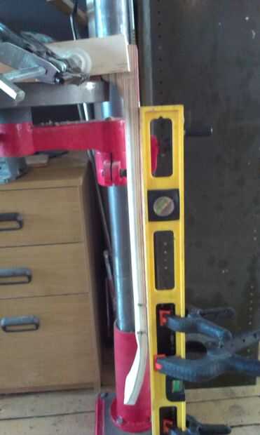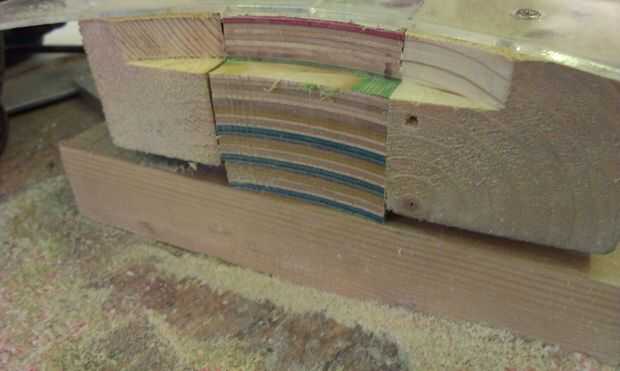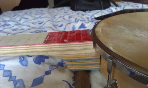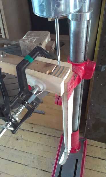 El aspecto estructural de la Unión viene de la palanca de espiga. He pasado mucho de tiempo hacer para perforar el agujero de la clavija en el cuello, creando una guía improvisada para asegurarse de que el agujero era exactamente vertical... y luego encontrar que el taladro de columna era no exactamente vertical! Afortunadamente descubrí mi asunción antes de hacer el corte. La espiga tenía que ser lijada para el agujero y luego pegados y atornillados. Tornillos adicionales podrían ser necesarias para dar fuerza adicional a las capas de capas de talón.