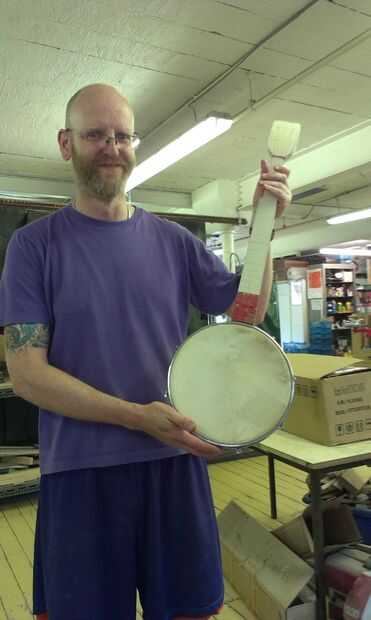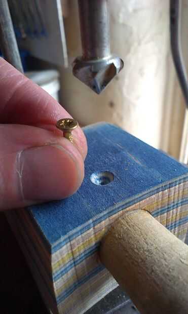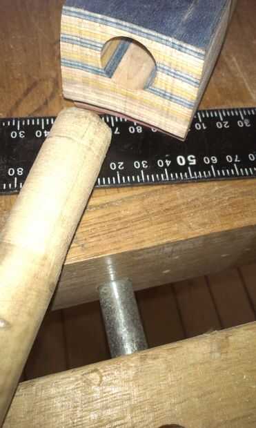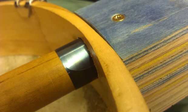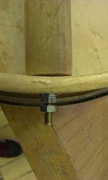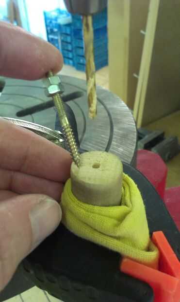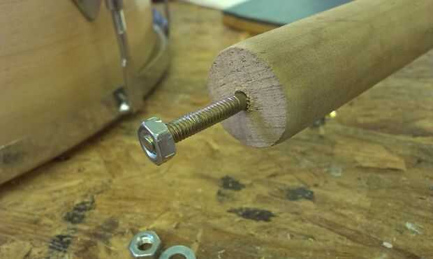 El palo de espiga se cortan a la longitud exacta y ligeramente redondeado para ajustar el radio interior de la olla. Una cosa media-máquina-tornillo-medio-reaprendizaje tirafondos (creo que es el término correcto!) proporciona la fijación asegurar el palo de la espiga en su lugar y también para establecer el ángulo que el cuello se reúne el bote, que a su vez establece la acción de la cadena en gran medida.