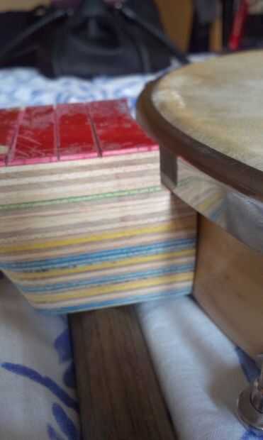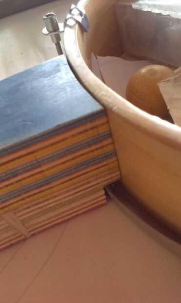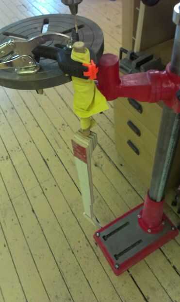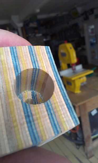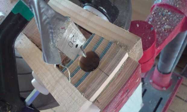 Comencé con un solo agujero en el borde con una acción que fue creado por el ojo y cortar sobre el taladro de columna con un poco de restos de madera lijada para encajar el borde interior de la olla.