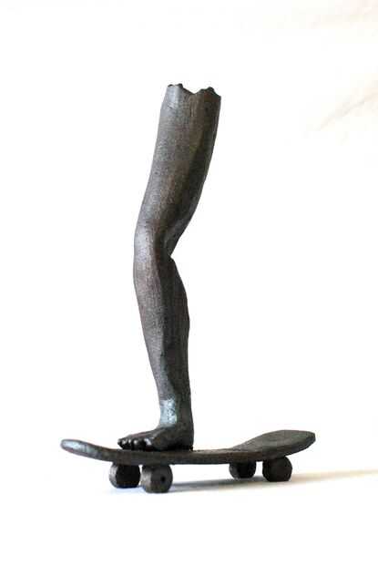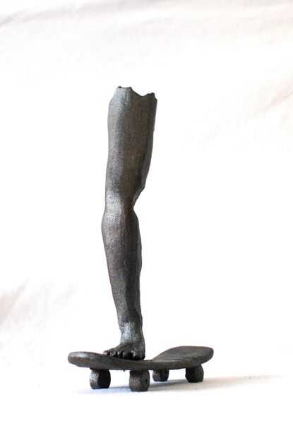 Es una pieza de cerámica dispararon alto. Tuve un montón de diversión con esta pieza, sobre todo siendo consciente de cómo iba a equilibrio durante todo el proceso. Primero construí la pierna; que debían ser hueco, asegurándose de que el patín puede apoyarlo. Una vez construido individualmente, yo, sumados los dos cuando estaban todavía en un estado húmedo. Una vez que era una sola pieza dispararon en la posición vertical, para asegurar que el acto de equilibrio quedaría equilibrado. Después de fue despedido, apliqué un óxido de hierro rojo para un acabado con una pistola de aire; (aplicar un color uniforme y consistente a lo largo). Por último, una vez que se aplicó el color, tiró en un lote bajo fuego para reaccionar con la mancha, dejándolo con una capa de plata diferentes.