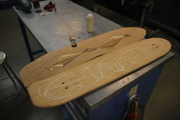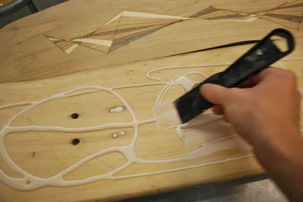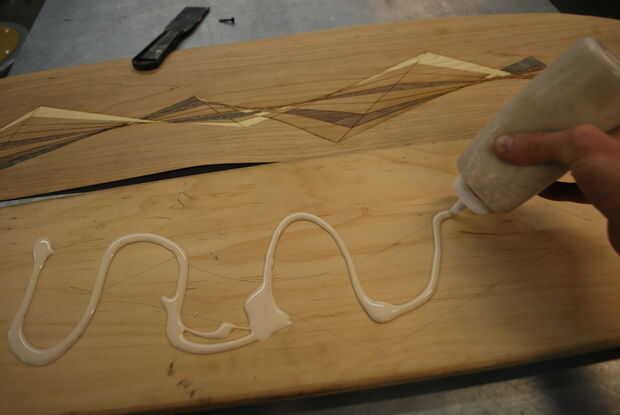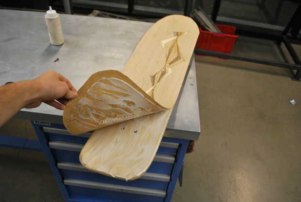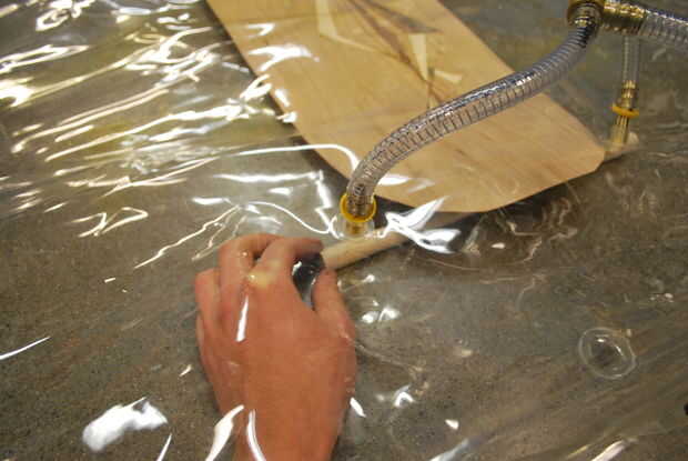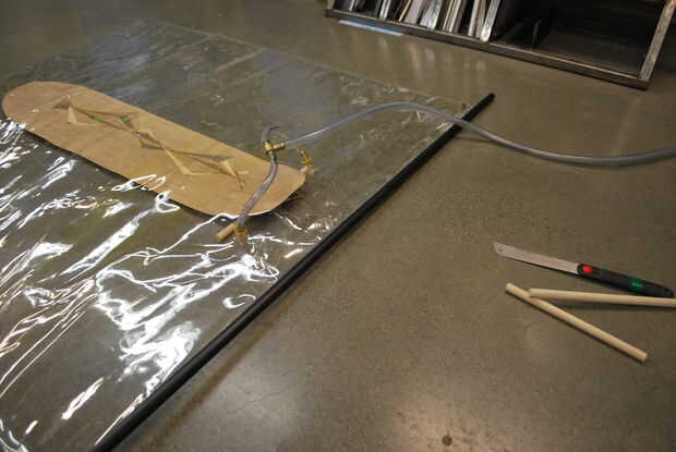 El mejor método para conseguir una presión uniforme sobre una superficie tan grande como un patín es utilizar una bolsa de vacío. Una vez que la Junta y la chapa se alinean cómo quieres diapositiva todo en la bolsa de vacío, cerrar la bolsa y encienda la bomba de aire.