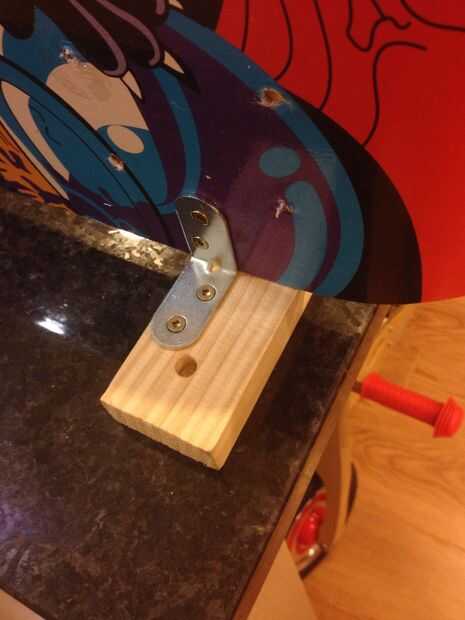 Ejes de mi patineta fueron ligeramente más anchos que la cubierta del patín. Así que perforé un agujero del mismo diámetro que los árboles de unos 8mm de profundo (igual que el alero). Tuve cuidado para poner a prueba la posición de cada axel quitar la rueda. Esto permite que el patín permanecer perpendicular a los rieles de madera una vez que los carros se vuelven a unir. También añadir fuerza vertical, permitiendo que los estantes para soportar peso extra.