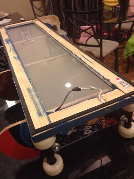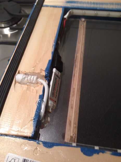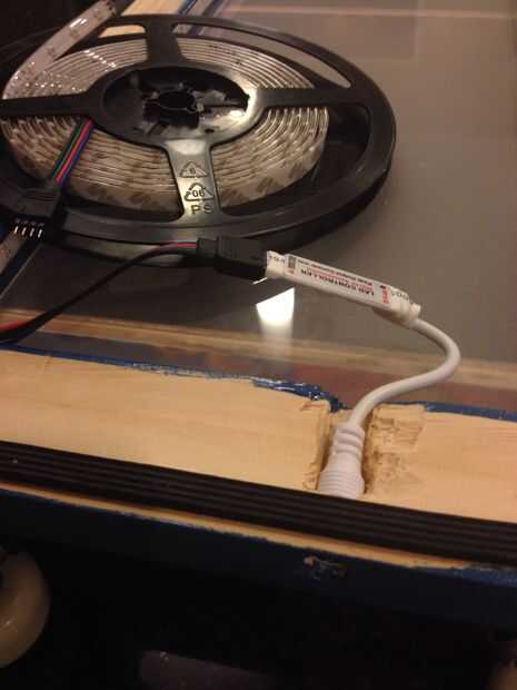 Flip sobre, caer en el plexiglás y luego perfore un agujero en la parte inferior para adaptarse a la toma de corriente del regulador RF LED mini. Cortar la tira de LED. Mi tira LED tenía forro adhesivo del uno mismo, así que usé esto para pegarlo alrededor del borde. También ayuda a mantener el plexiglás en su lugar, aunque utilizo unos puntos de pegamento caliente detrás de cada patín. También caliente pegué él toma de corriente y regulador de ritmo.