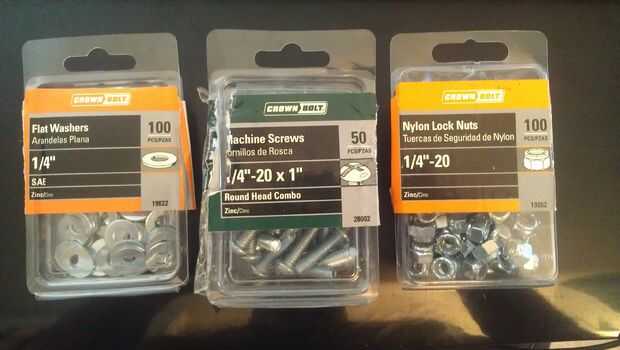 Hardware - he incluido una foto de lo que exactamente compró. No necesita tornillos de más de 50, pero su más barato abrir el cuadro y probablemente se podrá reutilizar en otro proyecto. MUY importante: Comprar tuercas de seguridad. Estas tuercas son similares a las tuercas que mantienen sus camiones conectados a su patín en que tienen una goma corteza dentro de ellos que impide aflojar/apretar no deseado.