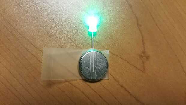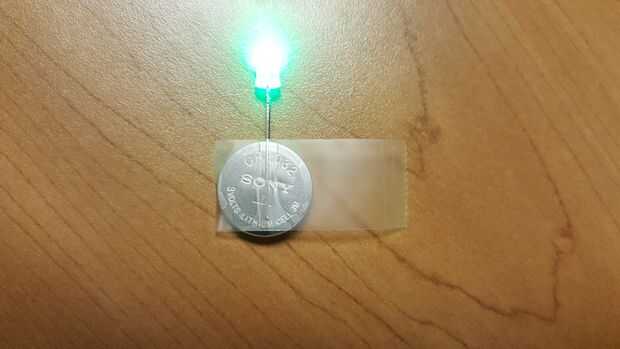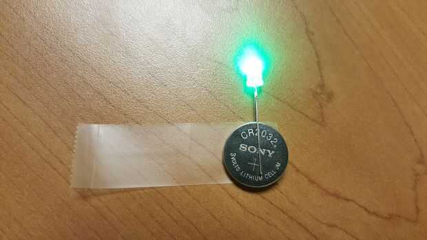 - Fije la cinta a la batería con el LED apuntando hacia arriba, como se muestra en la foto.