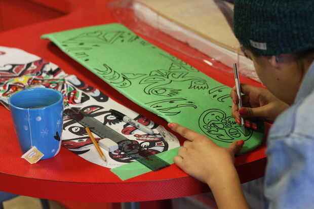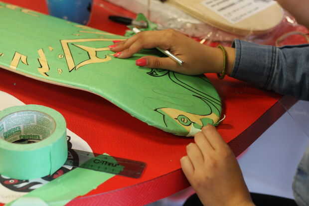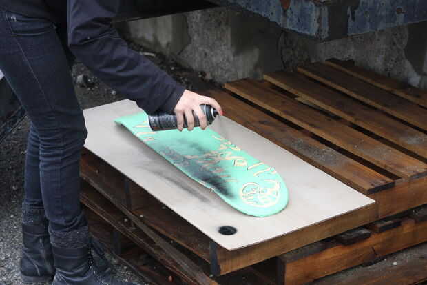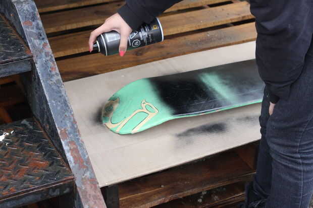 Dibujar los contornos de todas las áreas que desea pintar negro y luego recortar aquellas áreas con una navaja filosa. Lo que hace esto es crea una plantilla que te permitirá aplicar un color de pintura a todo el tablero, mientras cubriendo las áreas que son de diferentes colores.
