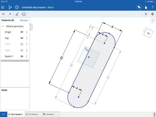 Crear las medidas de la Junta. OnShape puede descargarse en un iPad o un ordenador de sobremesa. Ver videos tutoriales necesarios para crear el patín de las siguientes dimensiones. 30 pulgadas de longitud total. 8 pulgadas de ancho. El medio círculo comienza 4 pulgadas desde el extremo de la tabla. Arriba se muestra más Descripción y una foto de nuestra modelo.
