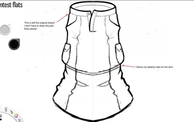 Luego te hacen una segunda capa y esbozar mi idea de la falda. Te conecto mi bosquejo con el lineart en la parte superior, con un pincel de lápiz negro. No estoy demasiado preocupado por lo que se vea bien. Sólo estoy tratando de averiguar primero mi idea!
