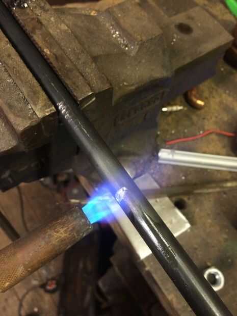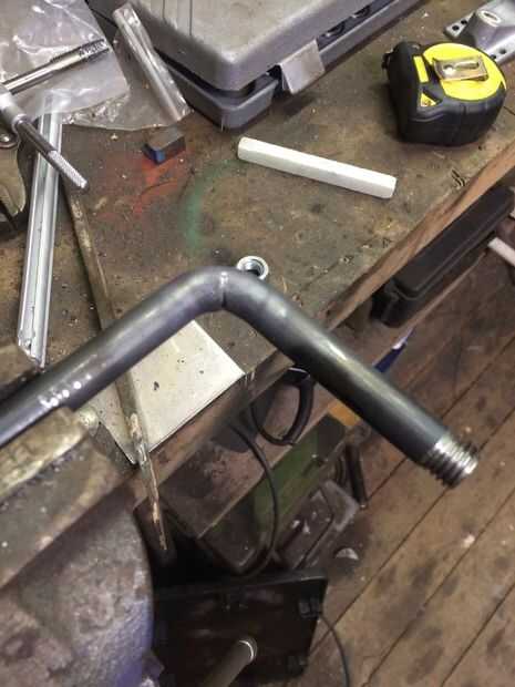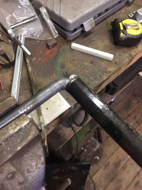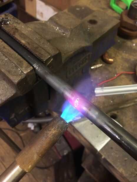 A continuación calienta las varillas de 12mm aproximadamente 3" del final con mi antorcha de gas MAPP, hasta que fue al rojo vivo y entonces usando un trozo de tubo como palanca, doblado las barras a un ángulo de 90 grados.