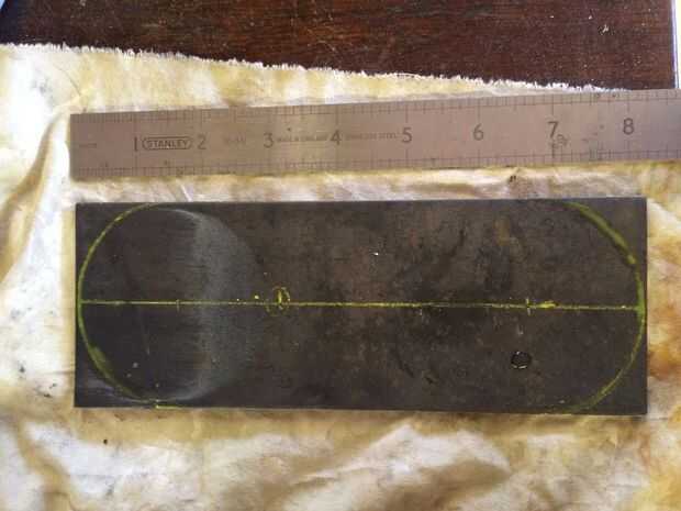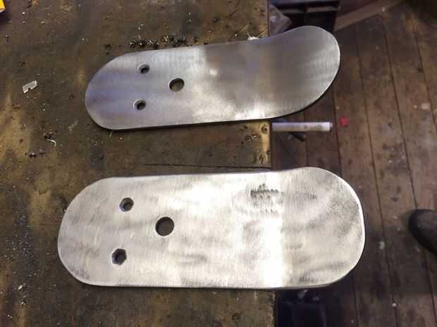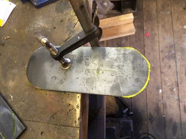 Mientras que el epoxi se ajuste en la placa base, me puse con las otras partes, bosquejó una forma áspera del patín en mi placa de acero y también marcó para 3 agujeros, 2 para los tornillos y uno para la barra de acero.
