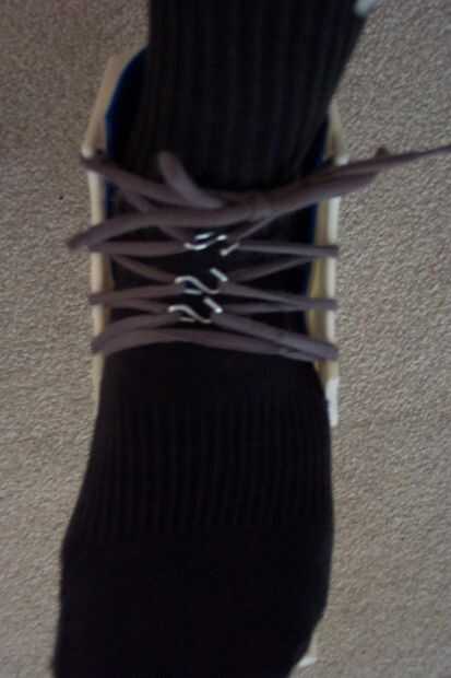 Alternativamente si tiene ganchos en S (ver fotos) puede usar estos y en vez de cordón entrecruzado alimentación sólo un lado de la cadena a cada lado del patín y una S del gancho en la cadena entre cada agujero en un lado. Usted puede conectar los cordones juntos de una manera mucho más rápida de entrar y salir de los patines. Ver fotos por ejemplo más clara.