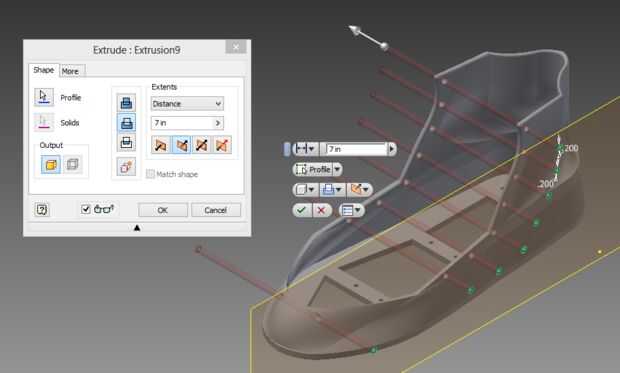 Para cortar los agujeros para el cordón de zapato en primer lugar vas a encontrar el plano que corta el zapato a lo largo, así que es el mismo en ambos lados. Para ello del mismo modo encontramos el plano de la placa base y usarlo para hacer un nuevo plano de desplazamiento. Este plano offset debe ser unas pocas pulgadas fuera del plano original no cruzan el arranque en todo; Hacer un dibujo nuevo en este plano y dibujar círculos (0,2 pulgadas de diámetro) por donde quieres colocar los agujeros para sus cordones. Asegúrese de agregar algunos agujeros en el dedo del pie para garantizar su lengua para que el patín más adelante. Sacar estos círculos a través de ambos lados de la raya. Use mis fotos para referencia.
