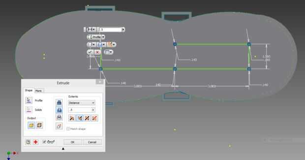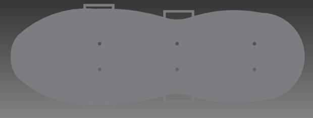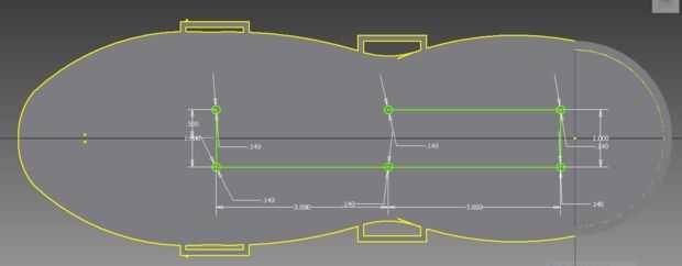 Ahora a montar la bota a la parte inferior de los patines en línea tenemos que añadir algunos agujeros de montaje. Las dimensiones por ellos pueden verse en la imagen (ignorar la placa-base tonta se dibujan en). Hay dos líneas separadas una pulgada aparte con tres agujeros en cada línea (diámetro de los orificios es de 0,14 pulgadas). El espaciado entre cada hoyo es de tres pulgadas. Dibujar un croquis en la parte superior de su placa personalizada, haga clic en 'Terminar Sketch' y utilizar la herramienta 'Extrude' otra vez para cortar de la placa base.