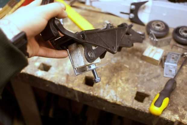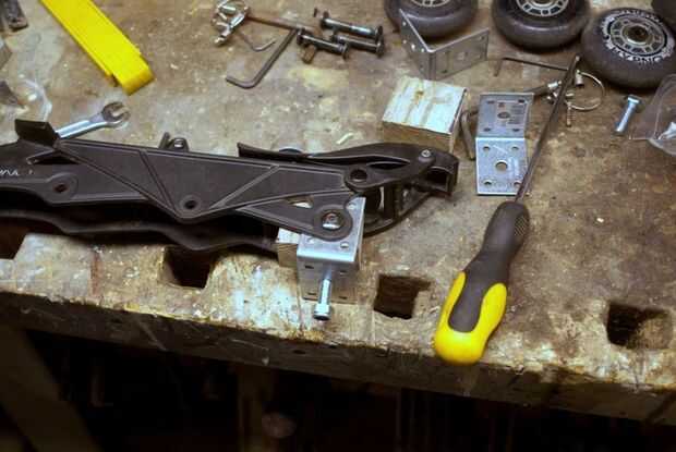 Montar el hierro de ángulo en la colocación de la rueda trasera en las fotos. Utilice un trozo de madera como una distancia en lugar de la rueda.