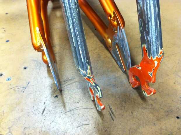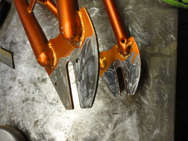 La estructura de rueda de patinete Desafortunadamente no era lo suficientemente amplia como para acomodar una rueda con una cadena así que tuvimos que persuadir suavemente a ampliar. Cortamos el patinete neumático trasero monta apagado y soldado con autógena bici del cabrito, usando la bici del cabrito como el montaje de neumáticos nuevos.