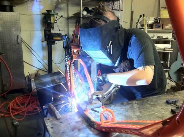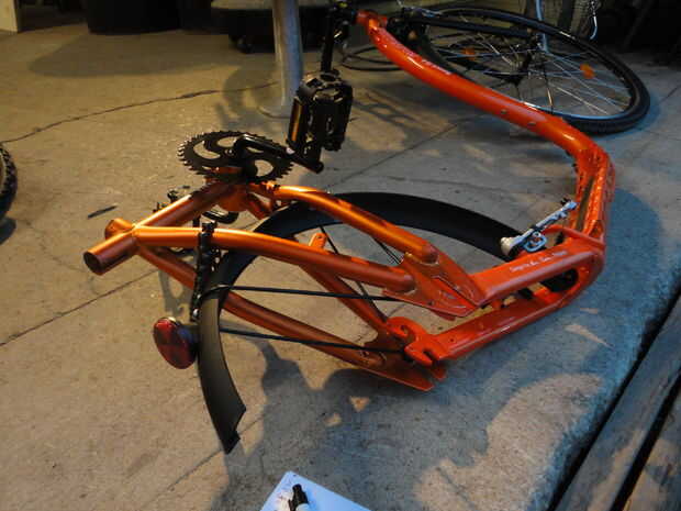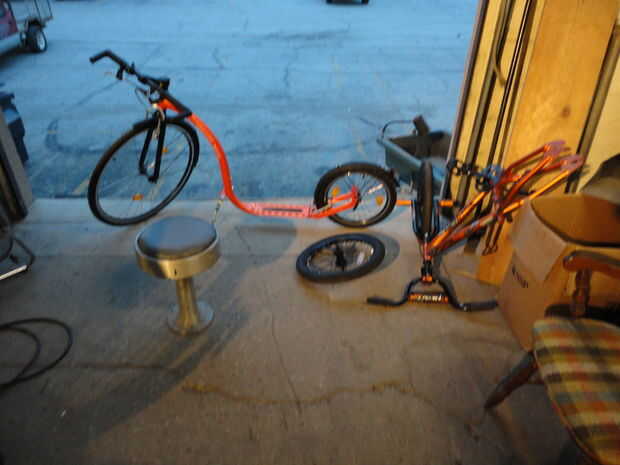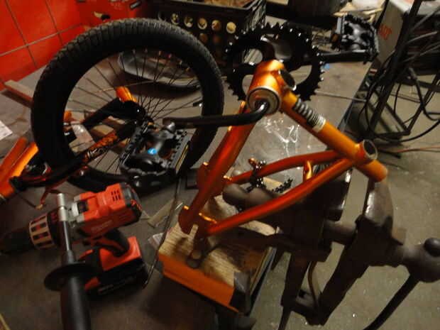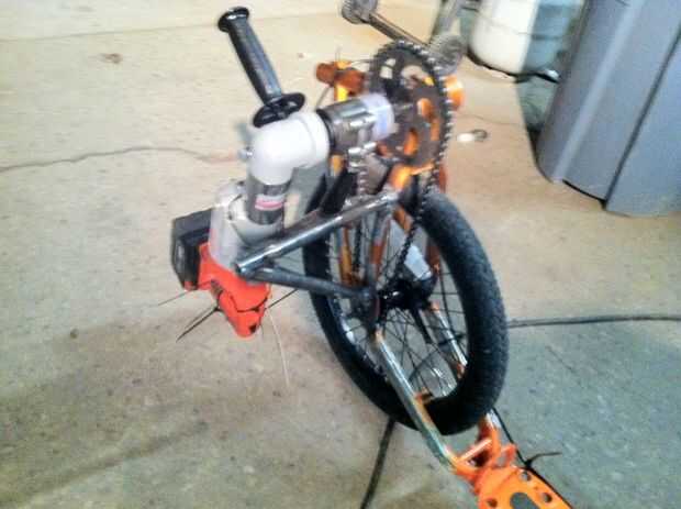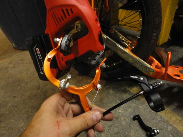 El acelerador se controla con la pinza de freno de bicicleta de niño conectado a una línea de freno tándem extra larga y una palanca de freno montada en el manillar. Actualmente la instalación recibe el trabajo pero un pedazo más personalizado también en las obras del gatillo del taladro Milwaukee.