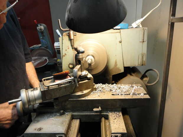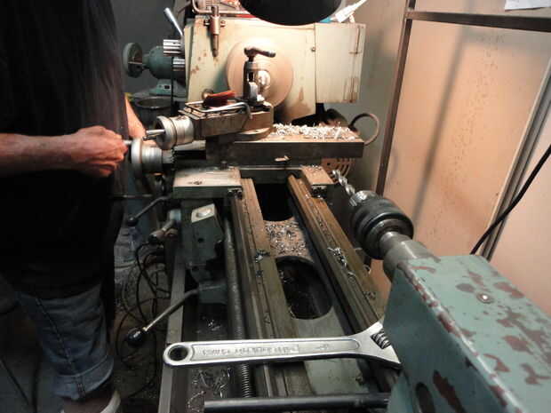 Hemos tenido más dificultades para encontrar una manera de conectar el taladro a la parte inferior soporte/biela y permanecer totalmente centrado. Terminamos agujerear un agujero en el torno y presionando el hilo de adaptador de Hougen dónde habría ido el brazo. Mediante el uso de este pedazo de hilo podemos quitar fácilmente y fije el taladro simplemente invirtiendo el taladro y golpear el gatillo un par de veces.
