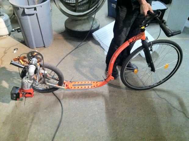 El patinete($259, Amazonas) parecía una opción obvia para que el vehículo de base porque queríamos hacer un scooter pero también quería la mayor estabilidad que se obtiene con una rueda delantera más grande, para cuando nos potencia a velocidades más altas. El patinete es básicamente una moto con la parte delantera de una bicicleta tamaño completa así que más o menos en el dinero. Para el taladro de motor necesitamos más par motor, la unidad más baja de RPM encontramos que terminó siendo la 0721-21Milwaukee M28 taladro de ángulo recto($369, herramienta eléctrica de Ohio) . Este ejercicio es de velocidad variable, basada en el tirón del disparador, de 0-400 RPM en baja engranaje (0-1000 RPM en alta) . La RPM baja incluso en esta unidad todavía era demasiado alto, así que tuvimos que encontrar un reductor que podría manejar el esfuerzo de torsión y hacernos aún más. El Hougen reductor 4:1 14008($175, herramienta eléctrica de Ohio) fue lo mejor que encontrado para el dinero y consigue el taladro velocidad 0-100 RPM con unas grave par a llevar yo, una persona de 225 libras, no hay problema.