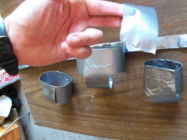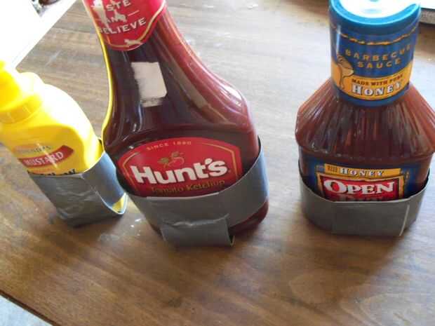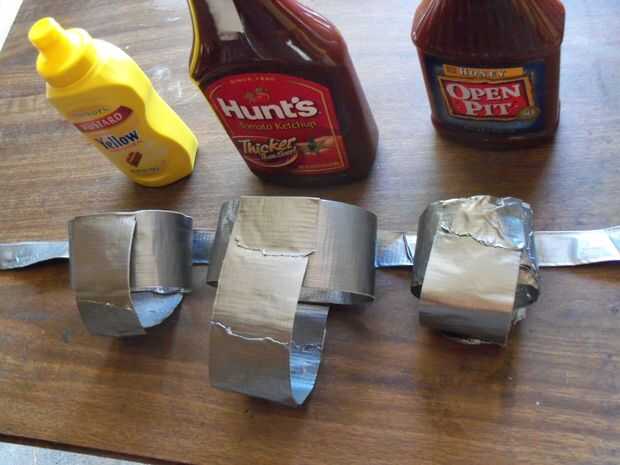 2. hacer que los titulares de cada una de primera haciendo bandas de cinta de conducto para la circunferencia y la circunferencia de cada condimento.
