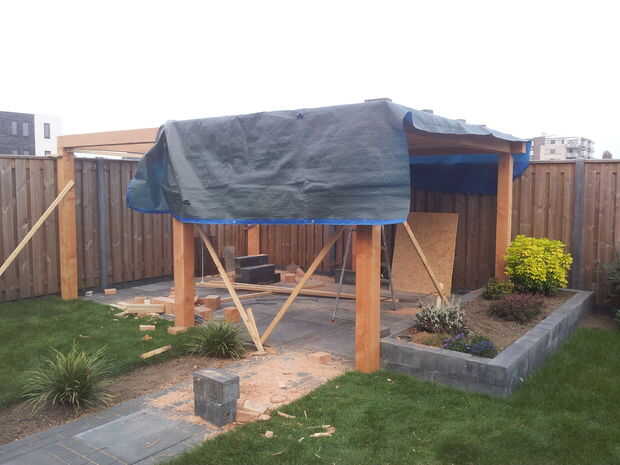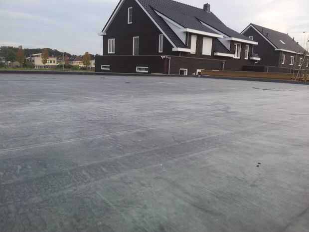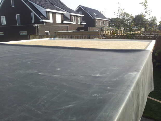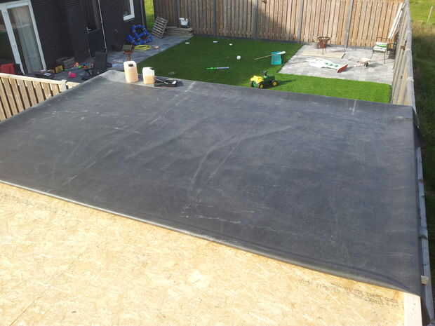 Luego fue tiempo para gleuing sobre el caucho EPDM. Este material es exactamente el mismo que la goma que usas en un estanque que es mejor adecuado contra la radiación UV del sol seca hacia fuera caucho con el tiempo. Cada vez que necesito pegar en EPDM otra vez no me va a hacer lo que hice con este patio construir. Pegué el primero la mitad y luego la segunda mitad. Las piezas en su camino a grandes para manipular ya que el caucho es masivo y pesado. Este material es también muy pegajoso y casi resultó mal. Todavía tengo unos pliegues desagradables que no podía estirar luego. La próxima vez que se extenderá la goma, lo coloque precisamente en el lugar y luego rodar op a 1 lado. Luego pegar en 1 metro y me baje el caucho y continu este proceso hasta su hecho. Al final resultó ok aunque.