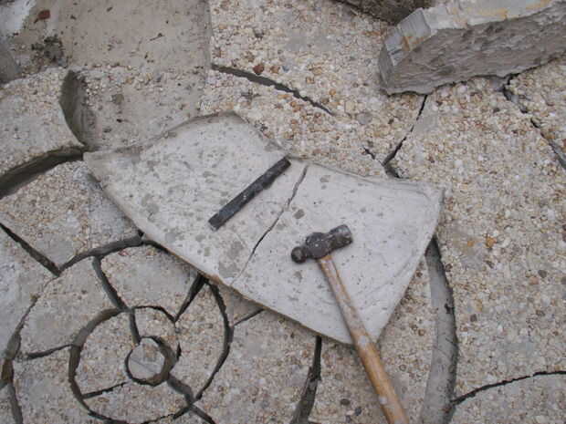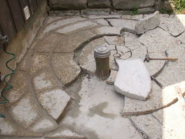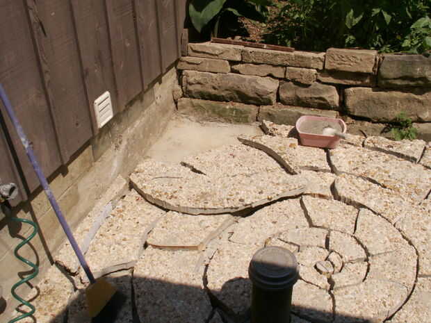 Primero rompen las partes boscosas del molde y sacar los ladrillos y los ponen donde van en la losa a partir la parte de afuera trabajando en. Una vez que los ladrillos se fijan a la losa, en el orden correcto. Es el momento para fijar los ladrillos sobre la losa.