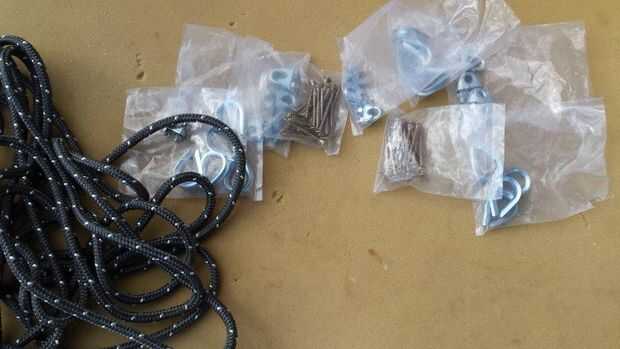 Algunas gargantillas, bisagras, cuerda semi pastic, algunos tornillos tornillos para madera, pino regular.