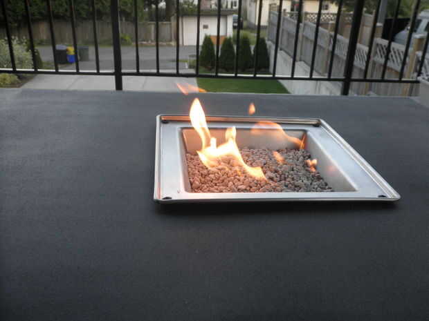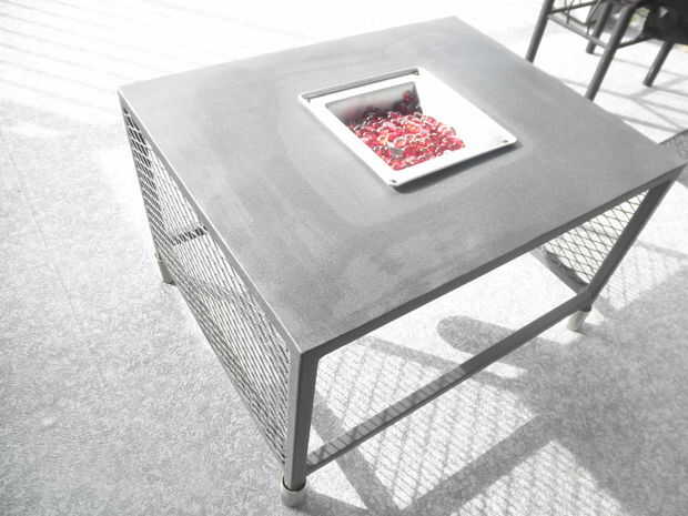 Esto es una mesa que hice para nuestro patio que tiene un mini fogón en el centro. Ideal para sentarse alrededor de la mesa de noche un poco de calor extra o luz.