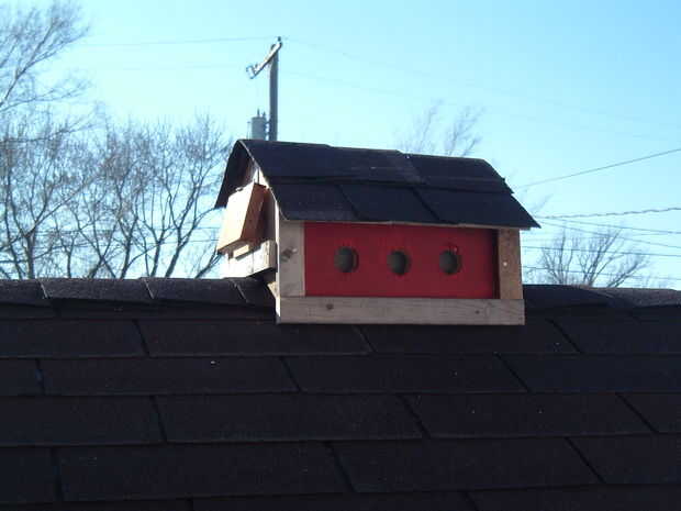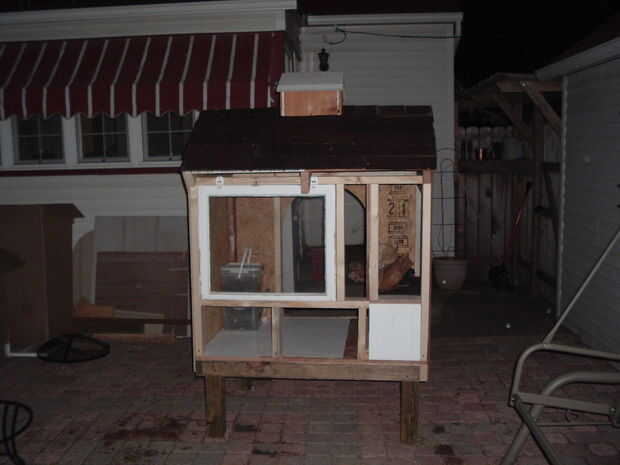 Corte 2x4s con ángulos para hacer tres conjuntos de vigas y fijarse con tornillos de tres pulgadas. Atornillada algo viejo gabinete de madera en las vigas para el techo, dejando un 4" agujero cerca de la cima del centro por una cúpula. Entonces tejas el tejado dejando abierto el agujero del pico.
