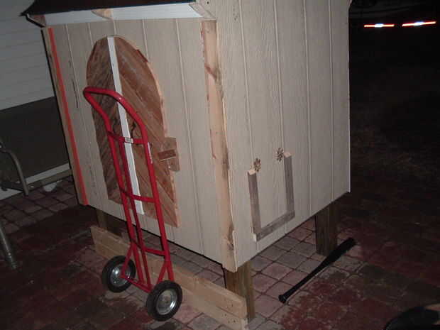 Cuando terminé el tonel, terminó siendo muy pesada; Adjunto algunas placas en la parte inferior y me usa una carretilla de mano para rueda (con ayuda) para su ubicación.