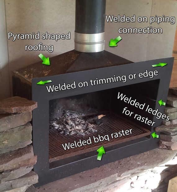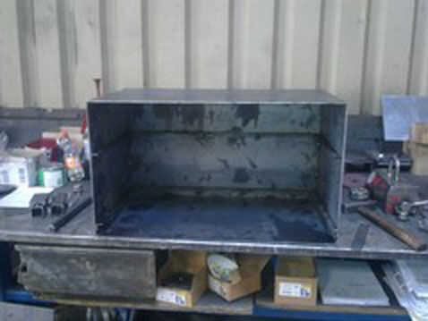 Lamentablemente no tengo muchas fotos del proceso de fabricación porque un amigo mío que es un soldador profesional hizo la mayor parte de la obra. Los diámetros donde 70cm de ancho, 40cm de altura y 40cm de profundidad. Esta hecho para una chimenea bastante grande pero que es la forma que quería que fuese. En la solo foto que tengo de la etapa de fabricación que puede ver que el 'techo' de la caja es plano. Después de un buen viejo prueba de fuego llegó a ser evidente que un techo plano no funcionó debido al desarrollo del humo dentro. El resultado fue que el humo salió de la gran apertura frontal y comenzó a llenar mi patio en vez de ir a través de la chimenea y el aire libre. * PARA LA TOS-TOS *