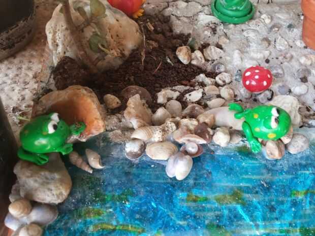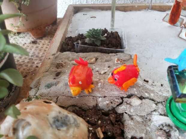 Mi Gallo n las gallinas (he plantado una variedad de musgo aquí que cubrirá este tipo de suelo y grietas en algunos días). Por lo que parecerá como si las gallinas se alimentan de ellos y las grietas se espaciar el musgo bien.