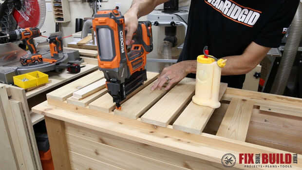 Cortar 2 1" 46" amplia repisa larga camillas y 11 lamas de 16-1/2". Pegue y clave los listones a la camilla espaciados uniformemente.
