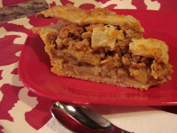 Vierta la mezcla de manzana en tartera forrada de pasta. Esparcir el streusel sobre las manzanas.